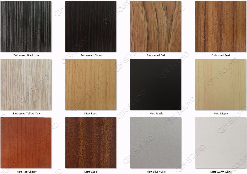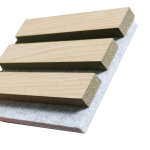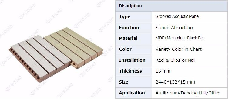 Qinsound Wooden Groove Wooden Acoustic Panels is wildly used in public area with it's good sound effect, variety of color and durable finishing. The panels have longitudinal grooves and slats, machined along the length of the panel.These panels are consist of a laminate finished surface, base core board and black acoustic felt attached on the back. The base core board is an 15mm thick MDF sheet (Middle Density Fiberboard) with a finish laminated to its front face and black acoustic felt adhered to its rear face. It is suitable for dancing hall, hotel, school, exhibition, office, lecture theater etc.
