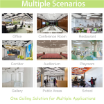 Qinsound fiberglass ceiling board are made of fiberglass and spray paint on surface, have excellent soundproof performance in both mid and high frequency. They are decorative and easy to installed. The paint on the surface are available in different colors and patterns. Customized is acceptable, you can also provide your own fabrics and designs.